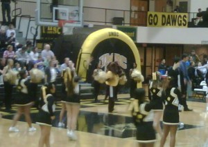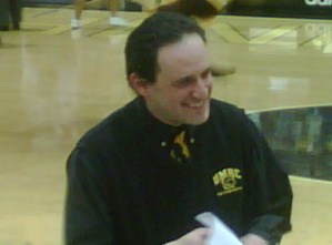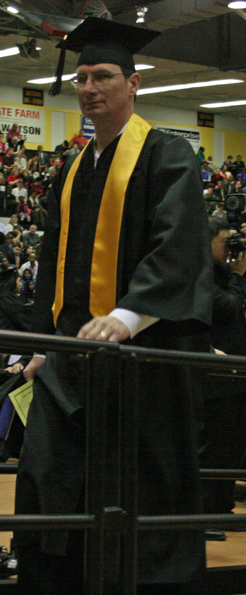 A large black curtain had been raised at the end of the basketball court as a backdrop to the stage; it was wide enough to fill in the area between the basketball championship banners and as tall. In front of it was the UMBC lettered logo. On the stage itself were banners representing each of the university’s colleges, and there were chairs from one side to the other to accommodate the many dignitaries. In the center of the stage was the main podium, with two smaller flanking podiums on either side. On the second floor, at the railing next to the track, an announcer acted as Master of Ceremonies during the processional.